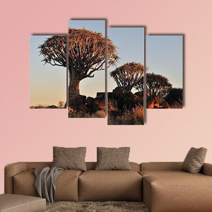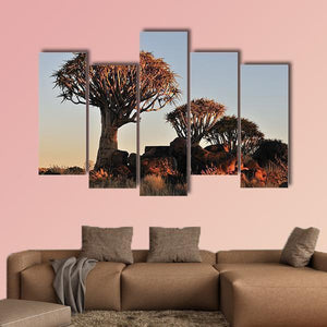 A realistic canvas print of quiver trees at sunrise in Namibia, centered in the frame with a low-angle view. Golden-hour light warms the rocks and grassland in brown, orange and blue tones for a serene, peaceful mood that suits modern or nature-themed rooms.