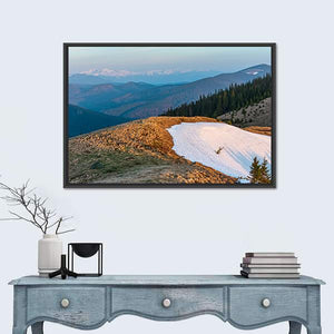 Experience the tranquil beauty of the Carpathian Mountains with this captivating canvas wall art. Featuring a serene landscape, it showcases a snow patch melting on a grassy hill, surrounded by a lush pine forest and distant snow-capped peaks. This piece brings a natural, expansive feel to any space.
