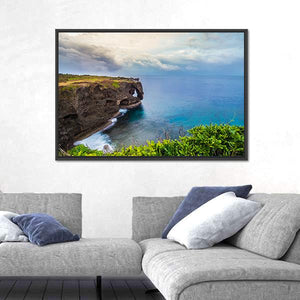 Sunrise on Manzamo Cape in Okinawa shows coastal cliffs, a natural rock arch and the ocean beneath soft clouds, in a palette of blues, greens, browns and grays. The realistic nature-photography style and serene, majestic mood make this print a calm focal point for a modern living room or coastal-inspired space.