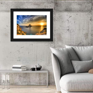 Sunset at Ibiza Island Canvas Art shows a striking rock formation rising from the sea as the sun sets over the ocean, framed by dramatic clouds. The vibrant, realistic palette of blue, orange, yellow, brown and gray creates a dramatic yet serene mood, well suited to modern or coastal room decor.