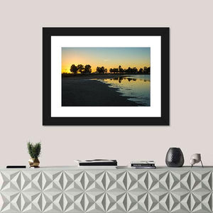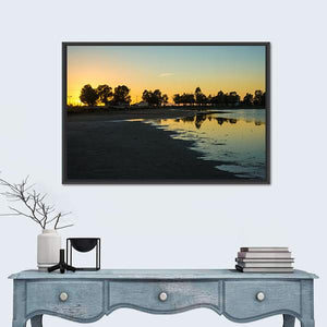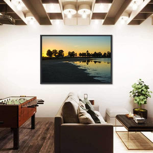 This canvas wall art showcases a serene sunset at the lakes of Messologgi, Greece, featuring stunning reflections in the calm water. The beautiful silhouette of trees against a colorful sky evokes a peaceful and reflective atmosphere, perfect for nature lovers.