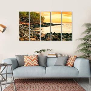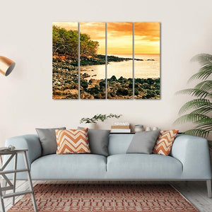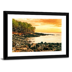 Capture the serene beauty of a Hawaiian sunset with this canvas wall art, featuring a stunning view of the ocean, rocky shoreline, and lush treeline. The warm palette of orange, brown, and green evokes a tranquil atmosphere, making it a great addition to your living space.