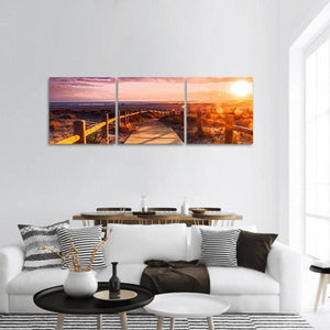 Panoramic canvas of a beach boardwalk at sunset near Almeria, Spain. Warm orange, pink and purple tones with a wooden boardwalk, fence and cloudy sky create a serene, peaceful mood. Its realistic coastal feel pairs well with modern or seaside-inspired interiors.