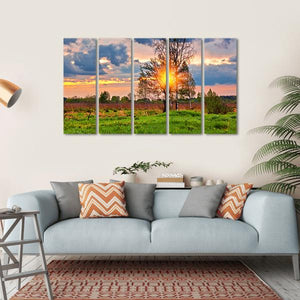 Capture the serene beauty of nature with this landscape featuring a majestic tree set against a vibrant summer sunset. The warm palette of greens, blues, and oranges evokes a peaceful atmosphere, making it a perfect addition to your wall decor.
