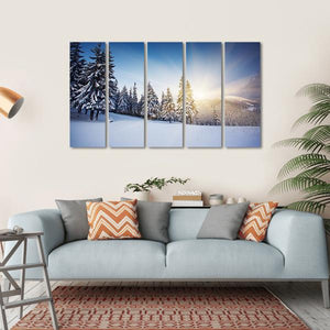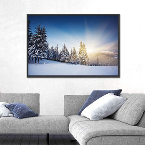 This artwork captures a peaceful winter landscape, showcasing snowy trees bathed in soft sunlight. The serene palette of blue and white invites a calming presence to any space.