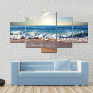 This canvas wall art captures the serene beauty of a beach at sunset, displaying vibrant ocean waves against a stunning sky. The photorealistic style evokes peacefulness and an appreciation for nature.