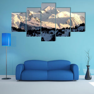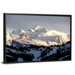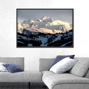 This canvas art features a breathtaking view of snowy mountains and evergreen trees under a tranquil sunset, showcasing majestic sunlit peaks and shadowed slopes. Its serene vibe makes it a beautiful addition to any room.