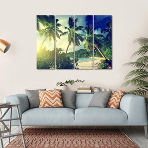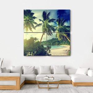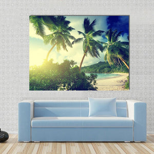 Bring the beauty of Mahe Island into your space with this vibrant canvas art featuring a stunning sunset over a tropical beach. The scene captures lush palm trees, the sparkling ocean, and warm hues of green and yellow that evoke a serene, natural atmosphere.