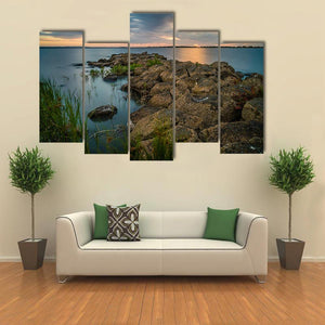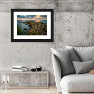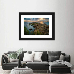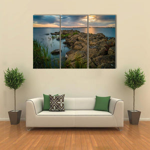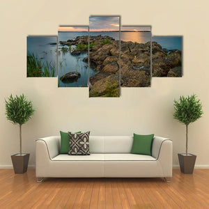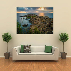 This realistic nature canvas captures a sunset over a stone pier at Lake Colac, with calm water, a rocky shoreline and dramatic clouds. Blue, brown and orange tones set a calm, serene mood that works well in living rooms or nature-inspired bedrooms.