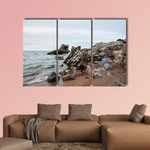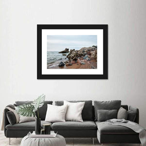 A realistic landscape showing a sunset above old, demolished military forts on a rocky shoreline, with gentle waves and varied rock colors. Composed using the rule of thirds and a muted blue-gray-brown palette, the print has a calm, natural mood that suits coastal or modern rooms.