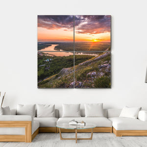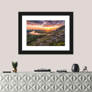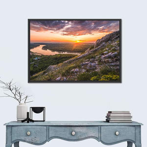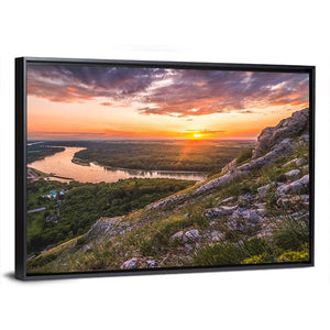 This canvas wall art beautifully captures a serene sunset over a winding river, framed by majestic mountains and lush forests. With its warm orange and purple tones, it brings a peaceful ambiance to any space.
