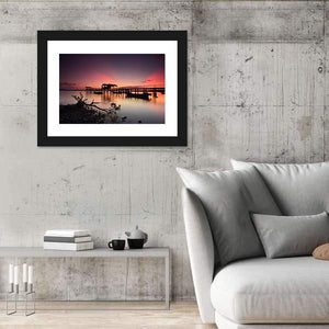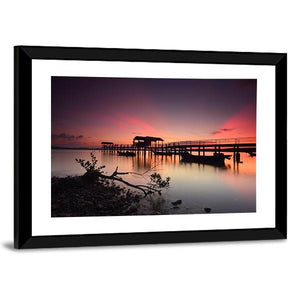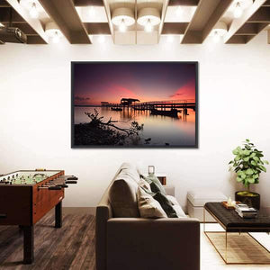 This beautiful canvas features a serene sunset over a wooden jetty, capturing the tranquil moment where the sky meets the water. The silhouetted pier and fallen tree branch add a romantic touch, making it a perfect piece for your home.