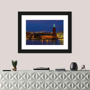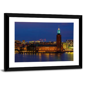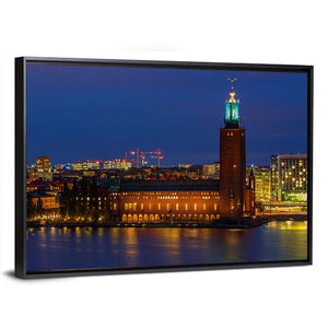 Sunset View Across Lake Malaren shows a cityscape with an illuminated building, a sky of blue and orange hues, and the building’s reflection on the water. The scene reads tranquil and nocturnal, a nightlife mood that fits modern living spaces and room decor.