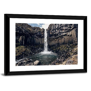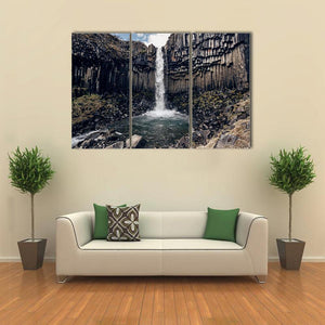 Svartifoss Black Waterfall Canvas Wall Art shows a centered waterfall framed by hexagonal basalt columns, rocky terrain and a pool of water. Dark grays, blues and whites give the scene a dramatic, powerful mood that works well in modern homes and nature-inspired rooms.