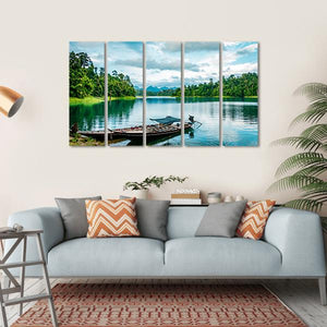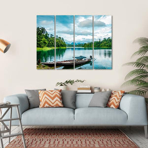 Bring the peaceful beauty of Thailand into your home with this serene canvas art featuring two wooden boats gently docked along a tranquil lake. The lush green hills and blue sky create a calming atmosphere, making it a wonderful addition to any nature-inspired décor.