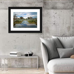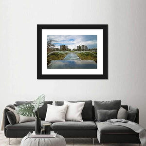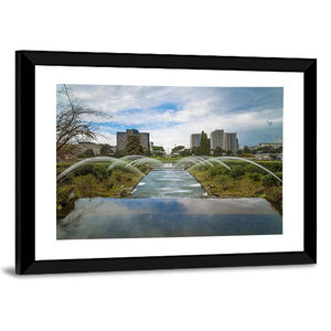 This canvas captures the artificial waterfall fountain in Rome, showing arcing water jets, surrounding buildings, and a cloud-speckled sky. A calm blue, green and gray palette and linear perspective give a peaceful, modern feel that works well in contemporary living spaces.