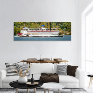 This captivating panoramic canvas art features a vintage paddlewheel riverboat, the Belle of Louisville, gracefully gliding along tranquil waters. Lush green trees frame the scene, creating a scenic and historical atmosphere perfect for nature lovers.
