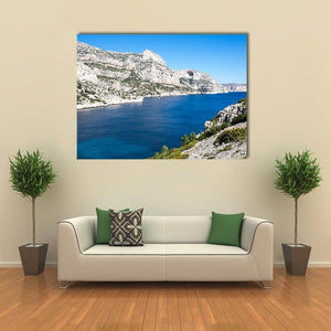 The Calanque de Morgiou Canvas Wall Art depicts the French coastline with clear blue water, rocky cliffs, and sparse coastal vegetation. Rendered in a realistic landscape and composed with a rule-of-thirds balance, it gives a serene, majestic sense of space that fits modern house interiors and nature-inspired room decor.