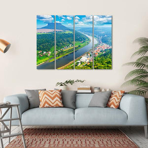 This artwork captures the serene beauty of the Elbe River, framed by lush forests and quaint towns. With vibrant blues and greens, it evokes a peaceful and expansive feeling, perfect for bringing a touch of nature indoors.