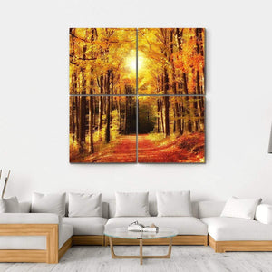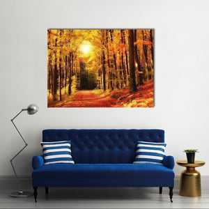 Experience the beauty of a serene forest path adorned with vibrant autumn trees and golden sunlight. This inviting canvas art captures the warmth of nature, making it an ideal addition to your home décor.