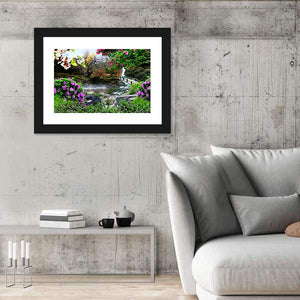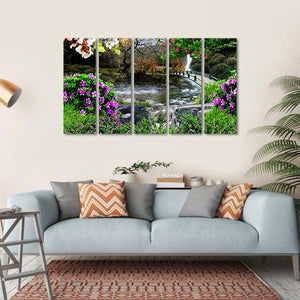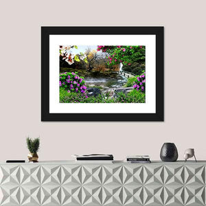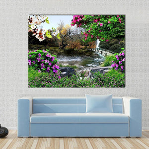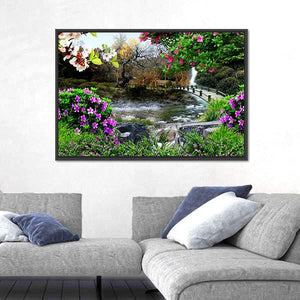 Capture the beauty of nature with this serene landscape. Featuring a tranquil river, a small arched bridge, and delicate butterflies among blooming flowers, this artwork brings vibrant colors to life. Perfect for adding a peaceful touch to any room.