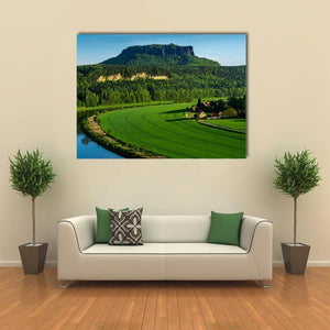 A peaceful landscape that shows a river winding through green fields and forest, with a flat-topped mountain above a distinct village. The rule-of-thirds composition and soft green-blue-brown palette give the scene a calm, natural feel. Suits modern home living spaces as subtle wall decor.