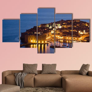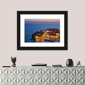The Old Town of Dubrovnik Canvas Art shows an aerial, wide-shot view of the coastal city and harbor at dusk, with illuminated buildings and calm water. The realistic blue, orange and golden tones give a serene, warm, inviting feel that suits coastal or contemporary rooms.