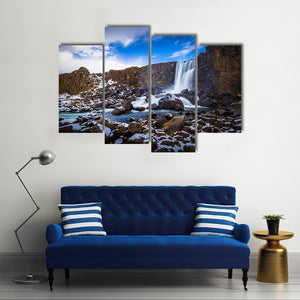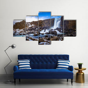 The Oxararfoss Waterfall Canvas Wall Art shows a powerful waterfall cascading over dark cliffs, with snow-covered rocks in the foreground and a bright blue sky above. Rendered in a realistic nature-photography style, the composition uses depth and framing to feel both dramatic and serene. Its natural palette of blue, brown, white, and gray fits well in modern, nature-inspired rooms.