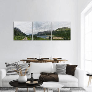 The Path To Middalsblu in Norway shows a panoramic, photorealistic landscape of a mountain lake, green hills, a dirt road and snow-capped peaks under a cloudy sky. The scene reads as serene and vast, with natural, majestic tones of green, blue, gray and white. Suited to modern living rooms, offices, or nature-themed spaces looking for calm, photographic wall decor.