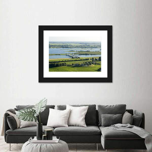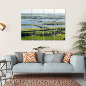 This canvas features a serene aerial view of the River Rhine, capturing lush fields, graceful trees, and a modern bridge. The calming palette of blues and greens evokes a peaceful atmosphere, perfect for enhancing your space with a touch of nature.