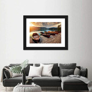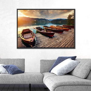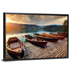 This canvas art captures the serene beauty of Lake Bled, featuring peaceful wooden rowboats and a stunning sunset palette. The tranquil scene, complete with dramatic clouds and gentle lakeside mountains, is perfect for enhancing your living space.