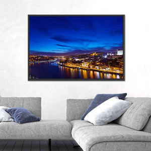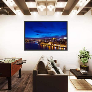 A photorealistic canvas showing the River Douro coastline at night, with a city skyline, bridge, and lights reflecting on the water. Blue and yellow tones create a vibrant yet serene urban nocturnal mood that fits modern living rooms and urban offices.