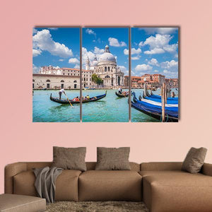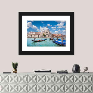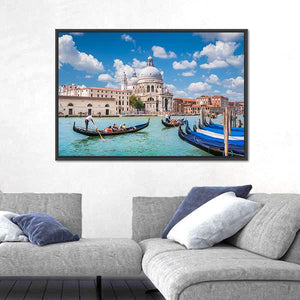 Traditional Gondolas on Canal Grande shows gondolas and riverside buildings beside a dome-shaped church in a realistic, scenic cityscape. The blue, white, beige and brown palette creates a vibrant, lively, historic atmosphere. Works well in modern or classic interiors as a travel-inspired wall accent.