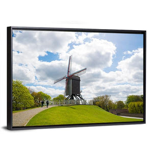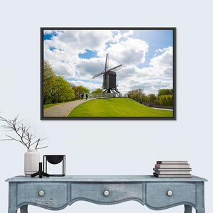 This canvas shows a traditional wooden windmill in Bruges set on a green hill, with a paved pathway curving left, trees, and fluffy white clouds in a blue sky. Rendered in a realistic landscape style with a rule-of-thirds composition, the artwork has a peaceful, serene, idyllic mood and works well in living rooms or hallways.