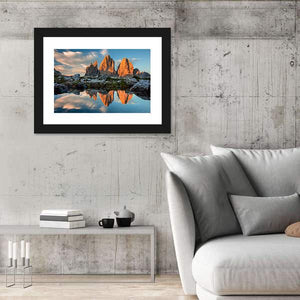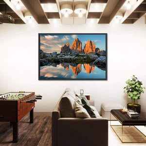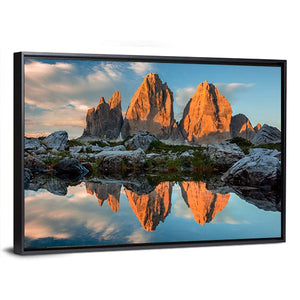 Tre Cime di Lavaredo rises above a calm alpine lake in this nature photograph, with sunlit peaks mirrored in still water. Clouds and a rocky foreground add depth while orange, blue, white, and gray tones create a majestic, peaceful mood. Works well in modern home spaces like living rooms or studies that favor nature photography.