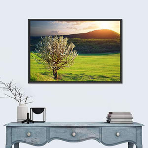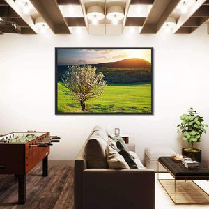 A realistic landscape of a blooming tree in a mountain meadow at sunset, set against dramatic clouds and rolling hills. A calm palette of green, blue, warm orange and white gives the scene a serene, warm, peaceful feel. The composition follows the rule of thirds and suits modern living spaces or rooms that favor nature-inspired wall decor.