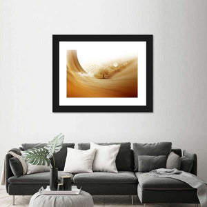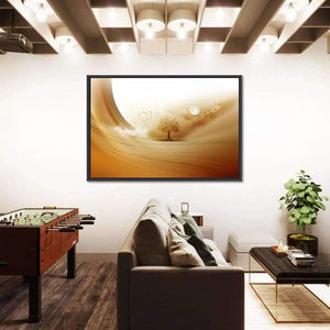 Tree In The Desert Canvas shows a stylized tree with birds and a moon set against an abstract desert night. Rendered in gold, brown, white, black, and green with swirling abstract lines and a rule-of-thirds composition, it offers a serene, dreamlike atmosphere that suits modern home decor like living rooms or bedrooms.