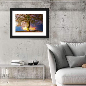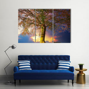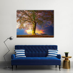 This canvas depicts a lone tree with fall foliage beside a solitary park bench under a dramatic sunset sky, creating a peaceful, tranquil scene. Rendered in a realistic style with orange, blue, green, and brown tones and composed using the rule of thirds, it suits modern home décor and nature-inspired rooms.