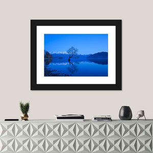 This canvas wall art features a bare tree reflecting beautifully in the calm waters of Lake Wanaka, surrounded by majestic snow-capped mountains. The serene blue and gray palette captures a tranquil winter twilight atmosphere, making it a perfect addition to spaces that embrace nature's beauty.