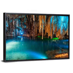 This captivating canvas art features a serene cave pool in Mexico, illuminated by underwater lights that reflect off large stalactites. The tranquil blues and earth tones create a mysterious atmosphere, making it a beautiful addition to any nature-inspired décor.