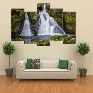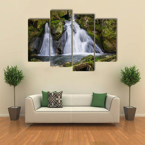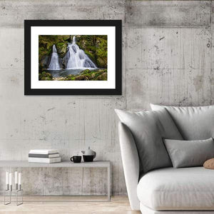 Two Terraces Of Triberg Waterfalls captures a realistic landscape of cascading falls amid mossy rocks and dense forest at Triberg. The image feels serene and natural, using green, white, brown and gray tones that suit modern or nature-themed rooms.