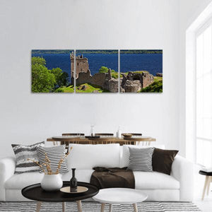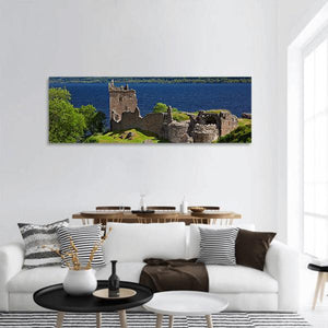 Urquhart Castle near Loch Ness is captured on a panoramic canvas, showing stone ruins beside dark blue water and lush green trees. The realistic, wide landscape gives a historic, scenic and peaceful mood. Works well in nature-inspired or modern rooms as a calm focal piece.