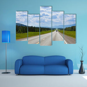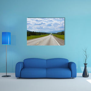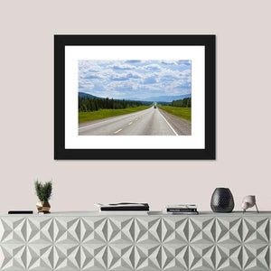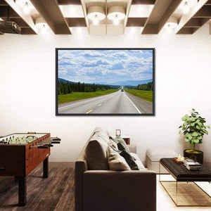 This canvas wall art captures a tranquil journey along a vast Alaskan highway. Featuring a winding road framed by trees and mountains, it offers a peaceful view that invites contemplation and travel inspiration.