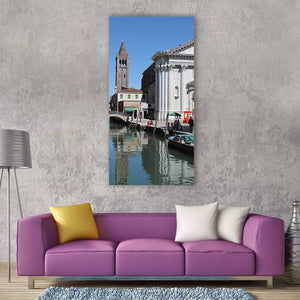 A photorealistic canvas view of a Venetian canal featuring a church tower, bridge and boat beneath a clear blue sky. The sunny, peaceful, historic scene—with the tower reflected in the water—adds a calm, classic cityscape touch to room decor and wall displays.