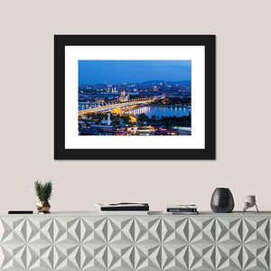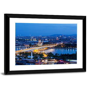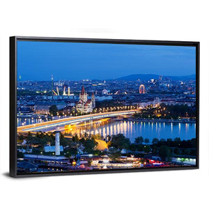 Vienna View At Night captures a panoramic city skyline with a bridge, river, lit buildings and a Ferris wheel under a deep blue night sky. The scene feels vibrant and bustling, with car lights on the bridge and building lights reflecting in the water. Its modern blues and yellow accents suit contemporary living rooms or offices.
