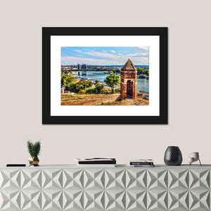 View of Belgrade and the River Sava presents a realistic, historic scene centered on a brick tower with an arched opening and stone cap, with boats on the river and the city skyline beyond under a bright blue sky with clouds. The scenic, daytime mood and a palette of red, blue, green and brown suits living rooms or offices with modern or nature-inspired decor.