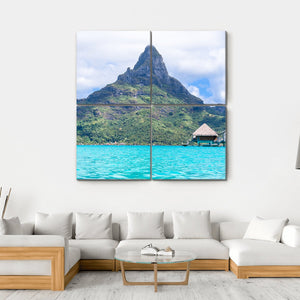 This canvas showcases a picturesque view of Bora Bora, featuring a majestic mountain, serene turquoise waters, and charming overwater bungalows. The tropical scene invites a calming and serene atmosphere into your space.