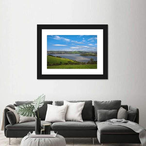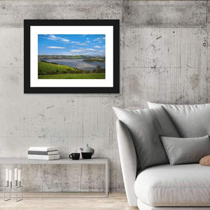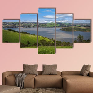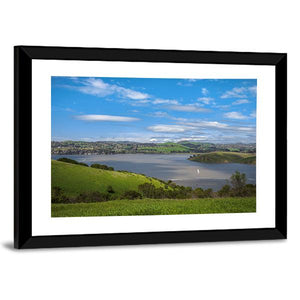 A realistic scene of the Carquinez Strait showing water, green hills, a small town and a sailboat under a clear daytime sky. The soft clouds and calm water give the piece a serene, natural mood that fits modern room decor like living rooms or offices.