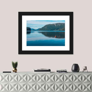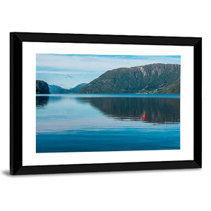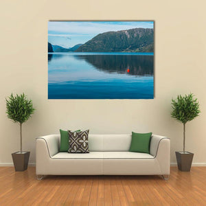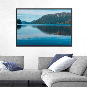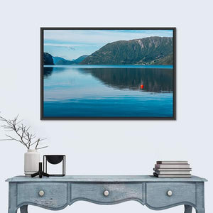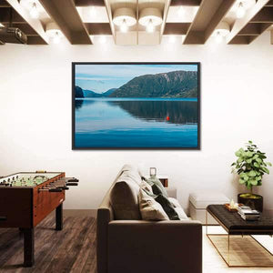 This landscape canvas depicts mountains above a calm lake, with a small orange buoy and clear reflections in the water. Rendered in blues, greens, gray and white, the modern image carries a peaceful, serene mood that suits simple, contemporary home decor.