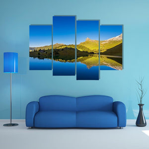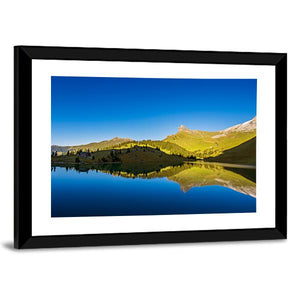 A realistic landscape of a mountain lake framed by forest, green hills and snow‑capped peaks. Soft blues, greens, yellows and whites, plus the clear reflection in the water, give the scene a serene, peaceful, and majestic mood. Suits modern room decor and quiet living spaces.